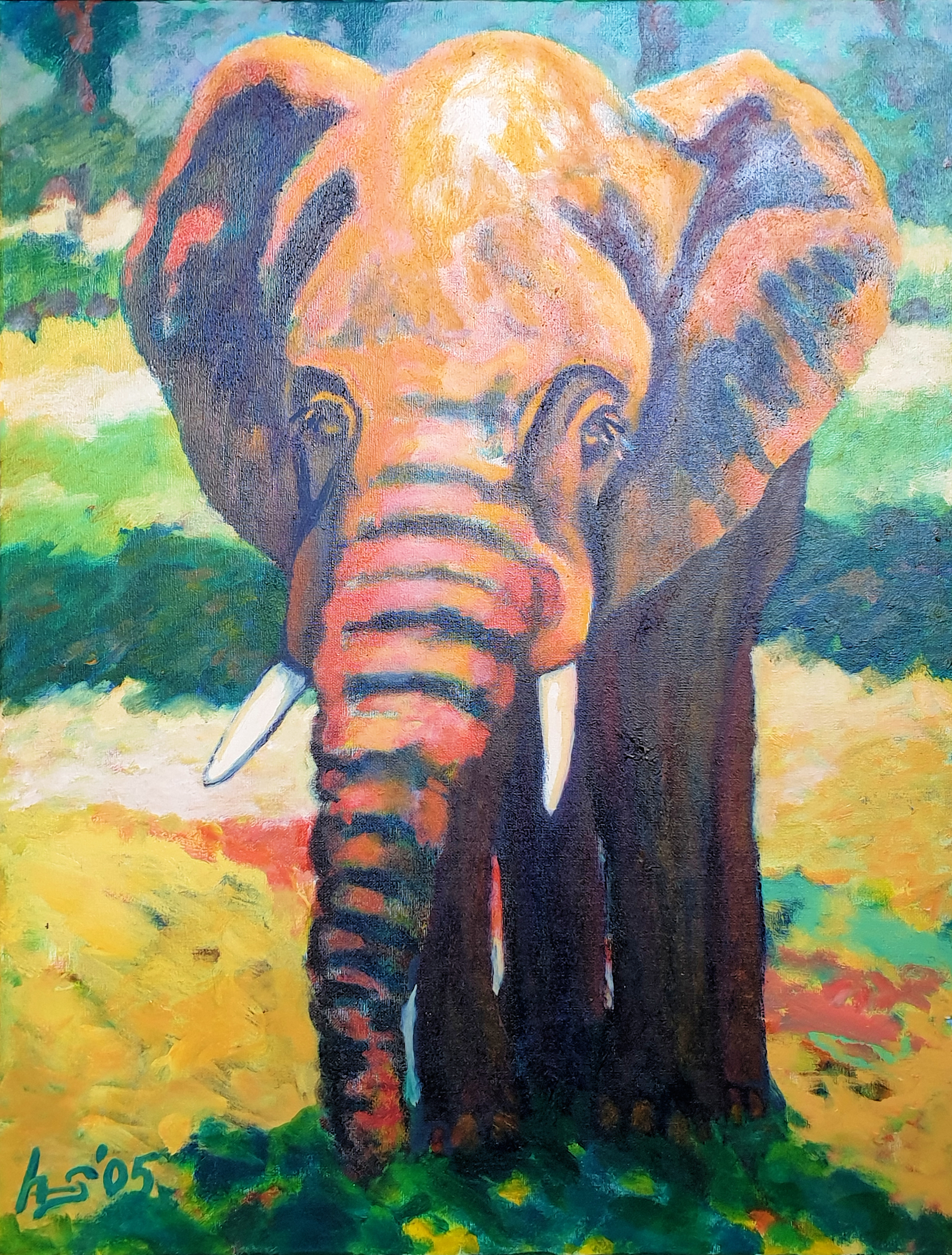 I see an elephant, which is head and colour and is unwavering. While I know those colossuses as grey and trunk and tree trunks of legs and improbably careful. I see Pegasus, the winged mythological horse of poets. However (following the Venus de Milo I would almost say) the wings are missing. 'They are not necessary', the painter seems to say, 'you can see that he is landing, those wings would only disrupt the image'. 'And look at that halo, the sparks are flying'. I see in the halo a truly dazzling variation on Armando's famous wheels, and I am won over. Further on hang paintings about love and passion.